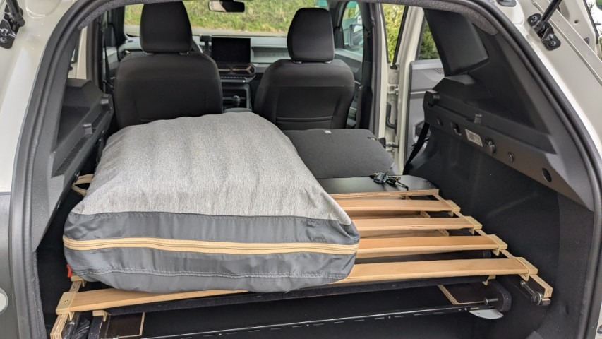 Sommier à lattes multiplies en trois parties séparables à la main sans outil. Ces trois parties se rangent dans le coffre.